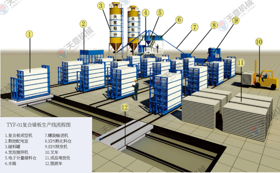 TY12型墻板生產(chǎn)線包括:墻板成型機、整體穿抽管系統(tǒng)、發(fā)泡系統(tǒng)、水箱、電子計量儲料倉、螺旋上料輸送機、儲料罐、螺旋輸送機、EPS熟化料倉、硫化干燥床、EPS預(yù)發(fā)機、數(shù)控配電室、發(fā)泡攪拌機、整體出板系統(tǒng)、叉車、成品堆放區(qū)、擺渡車。