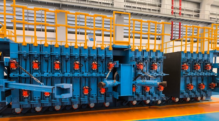 工作原理:模具的開合由下方的液壓機構(gòu)完成,和墻板機類似。合模后的鎖緊由上方和兩端的拉桿裝置實現(xiàn)。下方的強制同步裝置保證了大板在開合時的兩側(cè)同步。大板下方的輪組保證了大板在開合時不傾斜、不倒伏。