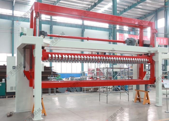 脫模后的坯體連同側(cè)板一起放置在切割小車上,切割小車由減速電機(jī)驅(qū)動行走,通過縱向切割機(jī)完成縱向切割,切割小車?yán)^續(xù)行走至橫向 切割機(jī)中間位置停止后,由小車置換裝置將側(cè)板連同坯體抬起,切割小車退回翻轉(zhuǎn)行車底下進(jìn)行下一次承載脫模后的坯體,另外一部切割小車 進(jìn)入置換裝置底下后, 置換裝置將側(cè)板連同坯體放置該切割小車上后,橫向切割動作后啟動進(jìn)行橫向切割動作,切割完成后,切割小車再行走至確地行車底下,再由 翻轉(zhuǎn)去底行車將坯體去底(連側(cè)板)吊至蒸養(yǎng)小車上,切割小車范圍原始位置進(jìn)行下一個切割循環(huán)。