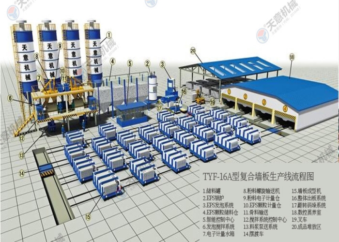 TYF-16A型復合墻板生產(chǎn)線是天意機械公司綜合國內(nèi)外技術(shù)經(jīng)驗,開發(fā)研制的新型墻體板材生產(chǎn)線。復合墻板生產(chǎn)線主要分為配料系統(tǒng)、攪拌系統(tǒng)、發(fā)泡系統(tǒng)、數(shù)控配電系統(tǒng)、墻板成型系統(tǒng)、料漿泵送系統(tǒng)、EPS預發(fā)系統(tǒng)、液壓循環(huán)系統(tǒng)、整體出板系統(tǒng)。